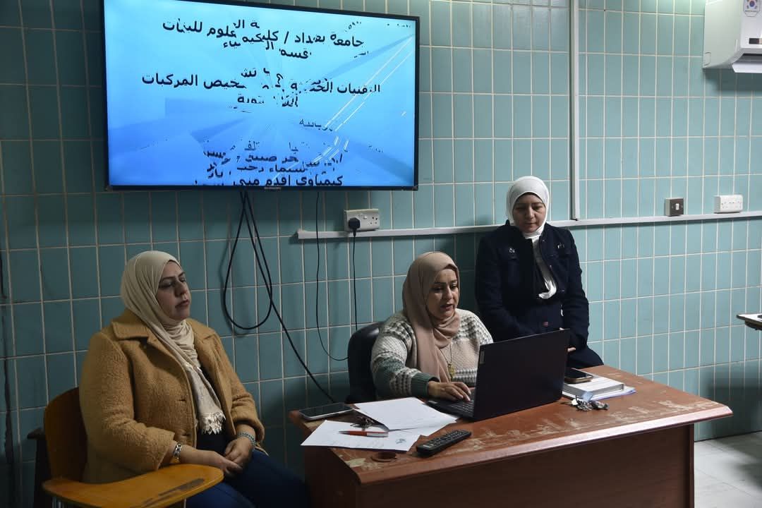 Under the patronage of the Dean of the College of Science for Women, Professor Dr. Sameera Naji Khdim, the Department of Chemistry, in collaboration with the Scientific Affairs Unit, organized a specialized scientific workshop titled “Modern Techniques in Diagnosing Inorganic Compounds.” The workshop was presented by Prof. Dr. Sahar Sabeih Hassan, Assoc. Prof. Shaimaa Rajab Abqar, and Chemist Mona Samir.