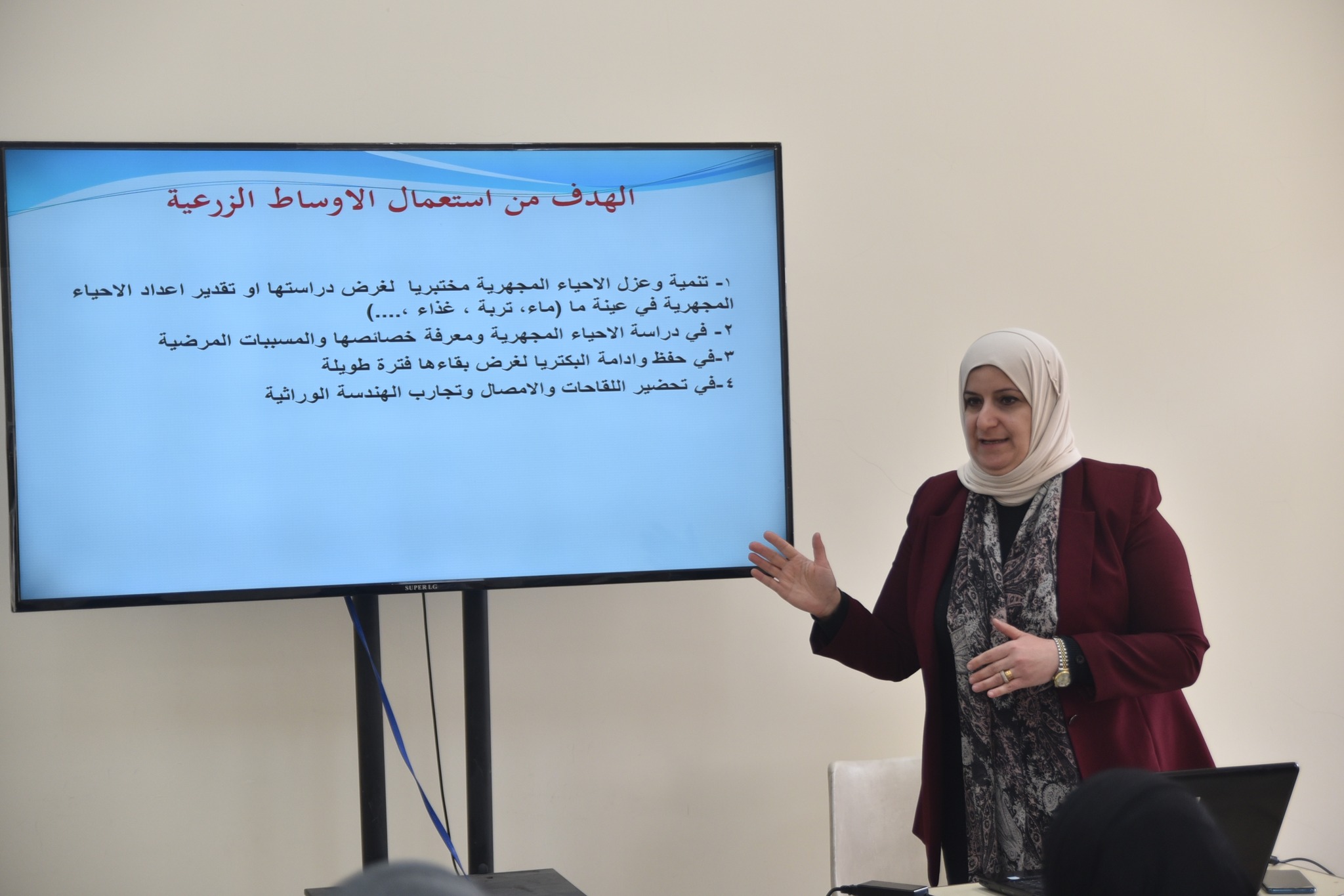 (Preparing culture media and methods of culturing and diagnosing bacteria) presented by Assistant Professor Dr. Rana Ali Hassan, Assistant Professor Dr. Zeina Hashem Shehab and Lecturer Nour Majed Abdullah in the presence of a number of students and lecturers in the department hall.